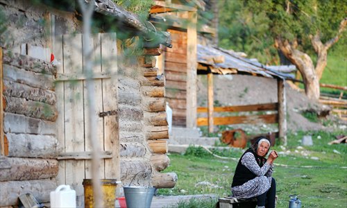 An elder Kazakh woman sits outside her wooden house in Yili, Xinjiang on June 7, 2016. In the mountains in the Tekes areas in Yili, many herdsmen live traditional lives.Photo:Cui Meng/GT