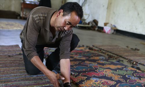 A man cuts off the extra hanging threads from a newly-woven carpet. Photo: Li Hao/GT