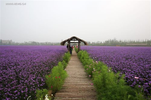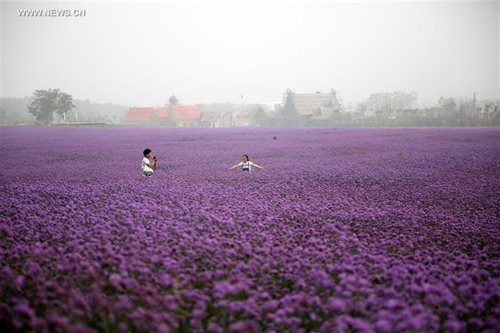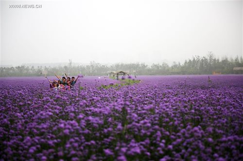 Tourists enjoy themselves in a verbena flower field in western coast economic zone in Qingdao, east China's Shandong Province, July 17, 2016. The verbena fields here, which cover an area of 130 mu (8.7 hectares), attracted a good many tourists. (Xinhua/Zhang Jingang)