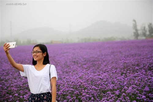 A tourist makes a selfie in a verbena flower field in western coast economic zone in Qingdao, east China's Shandong Province, July 17, 2016. The verbena fields here, which cover an area of 130 mu (8.7 hectares), attracted a good many tourists. (Xinhua/Zhang Jingang)