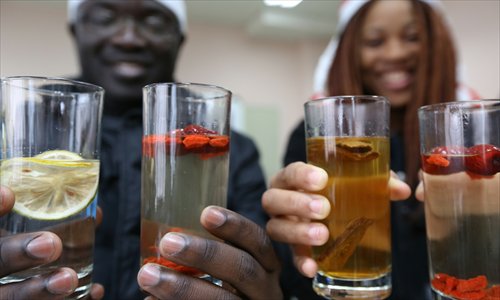 Emmanuel Omari-Siaw (left) from Ghana and Melody Shumba from Zimbabwe display two cups of tea made from Chinese herbs in December 2014. The two students studied traditional Chinese medicine in Jiangsu University. Photo: IC