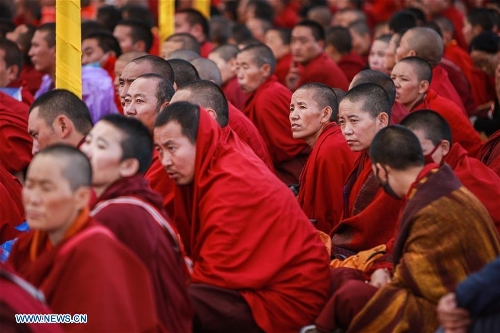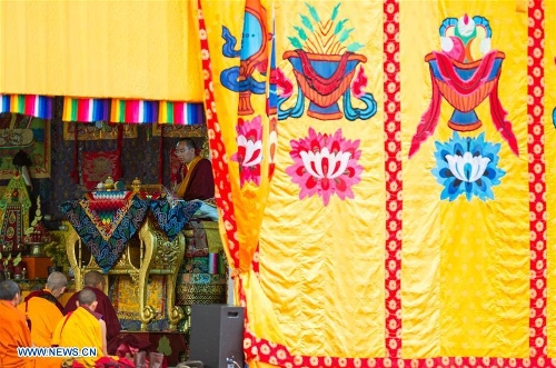 Monks listen to the sermon delivered by the 11th Panchen Lama Bainqen Erdini Qoigyijabu during the Kalachakra ritual in Xigaze, southwest China's Tibet Autonomous Region, July 21, 2016. The first tantric Kalachakra instructions delivered by the 11th Panchen Lama Bainqen Erdini Qoigyijabu formally started, with some 40 monks beginning a closed-door observance of Yidam, the Kalachakra deity, Thursday morning. The Kalachakra (the wheel of time) ritual includes a series of tantric teachings and initiations given by gurus to help Buddhists through the cycle of life. (Xinhua/Zheng Huansong)