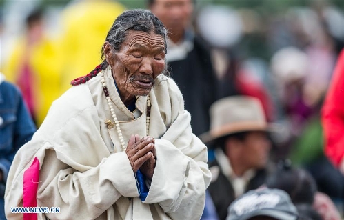 A devotee listens to the sermon delivered by the 11th Panchen Lama Bainqen Erdini Qoigyijabu during the Kalachakra ritual in Xigaze, southwest China's Tibet Autonomous Region, July 21, 2016. The first tantric Kalachakra instructions delivered by the 11th Panchen Lama Bainqen Erdini Qoigyijabu formally started, with some 40 monks beginning a closed-door observance of Yidam, the Kalachakra deity, Thursday morning. The Kalachakra (the wheel of time) ritual includes a series of tantric teachings and initiations given by gurus to help Buddhists through the cycle of life. (Xinhua/Purbu Zhaxi)