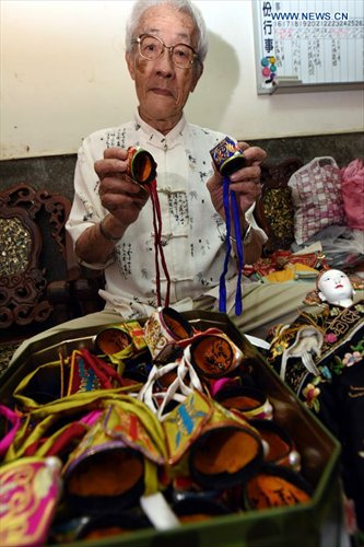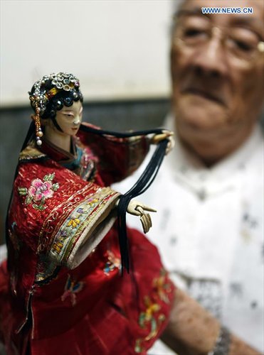 Chen Xihuang, an 85-year-old glove puppetry inheritor, shows his collection of glove puppets in Taipei, southeast China's Taiwan, July 23, 2016. Chen began learning glove puppetry when he was 13 years old, and he is the third-generation inheritor of this old art form in Taiwan. Glove puppetry is one of the traditional forms of puppet performance popular in the region of south China. Photo: Xinhua
