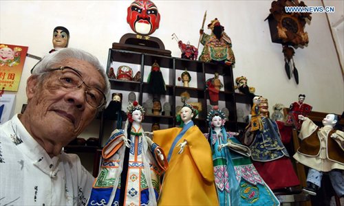 Chen Xihuang, an 85-year-old glove puppetry inheritor, shows his collection of glove puppets in Taipei, southeast China's Taiwan, July 23, 2016. Chen began learning glove puppetry when he was 13 years old, and he is the third-generation inheritor of this old art form in Taiwan. Glove puppetry is one of the traditional forms of puppet performance popular in the region of south China.Photo: Xinhua