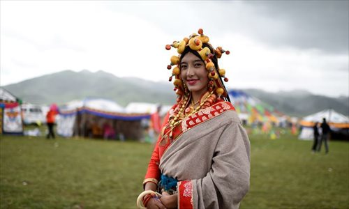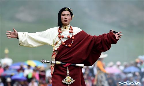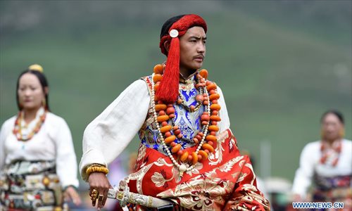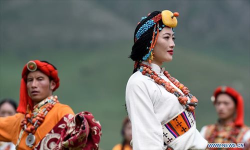 A model presents traditional Tibetan costumes during a fashion show held at Batang grassland of Yushu City of Yushu Tibetan Autonomous Prefecture, northwest China's Qinghai Province, July 26, 2016. (Xinhua/Zhang Hongxiang)