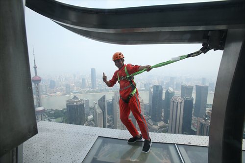 A staff member tests the newly opened glass skywalk outside the 88th floor of Jin Mao Tower on Thursday. With a harness, visitors can look down on the city from 340.6 meters above ground. It is the highest glass skywalk without a guard rail. Photo: Yang Hui/GT
