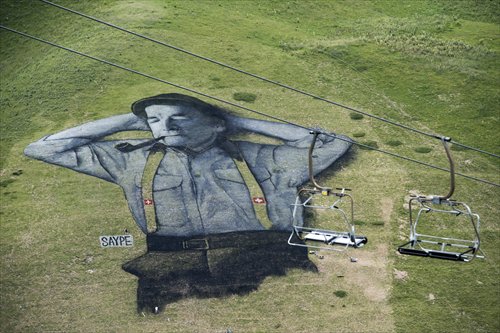 Armed with a spray gun and lugging buckets of flour, water, and pigment, a French artist has overcome storms and burrowing moles to turn a Swiss hillside into what is believed to be the world's largest painting on grass.