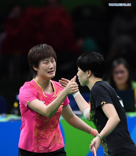 China's Ding Ning (L) shakes hands with her compatriot Li Xiaoxia after the women's singles gold medal match of table tennis at the 2016 Rio Olympic Games in Rio de Janeiro, Brazil, on Aug. 10, 2016. Ding Ning won the gold medal. (Xinhua/Lin Yiguang)
