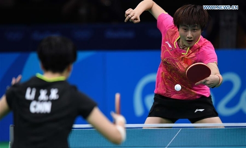 China's Ding Ning returns the ball against her compatriot Li Xiaoxia during the women's singles gold medal match of table tennis at the 2016 Rio Olympic Games in Rio de Janeiro, Brazil, on Aug. 10, 2016. (Xinhua/Shen Bohan)