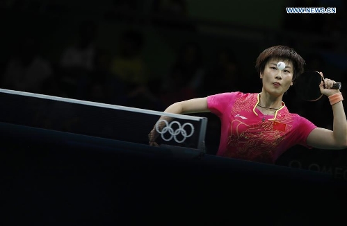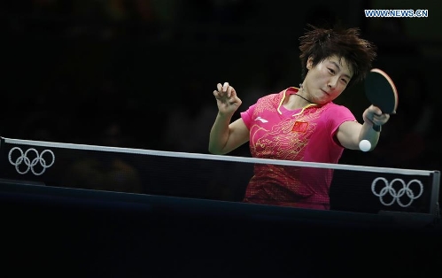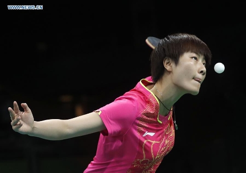 China's Ding Ning serves the ball against her compatriot Li Xiaoxia during the women's singles gold medal match of table tennis at the 2016 Rio Olympic Games in Rio de Janeiro, Brazil, on Aug. 10, 2016. Ding Ning won the gold medal. (Xinhua/Shen Bohan)