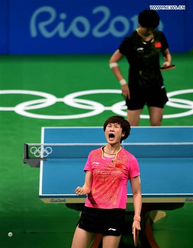 China's Ding Ning reacts during the women's singles gold medal match of table tennis against her compatriot Li Xiaoxia at the 2016 Rio Olympic Games in Rio de Janeiro, Brazil, on Aug. 10, 2016. Ding Ning won the gold medal. (Xinhua/Lin Yiguang)