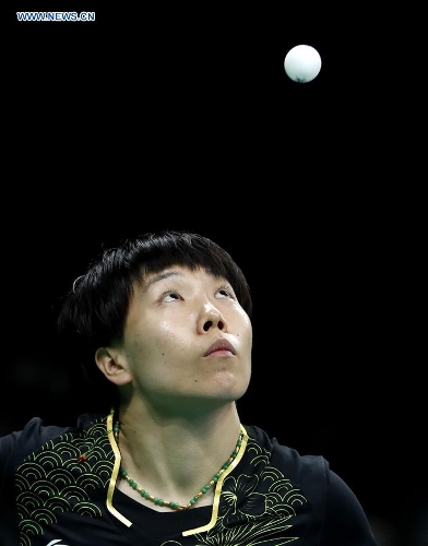 China's Ding Ning serves against her compatriot Li Xiaoxia during the women's singles gold medal match of table tennis at the 2016 Rio Olympic Games in Rio de Janeiro, Brazil, on Aug. 10, 2016. Ding Ning won the gold medal. (Xinhua/Lin Yiguang)