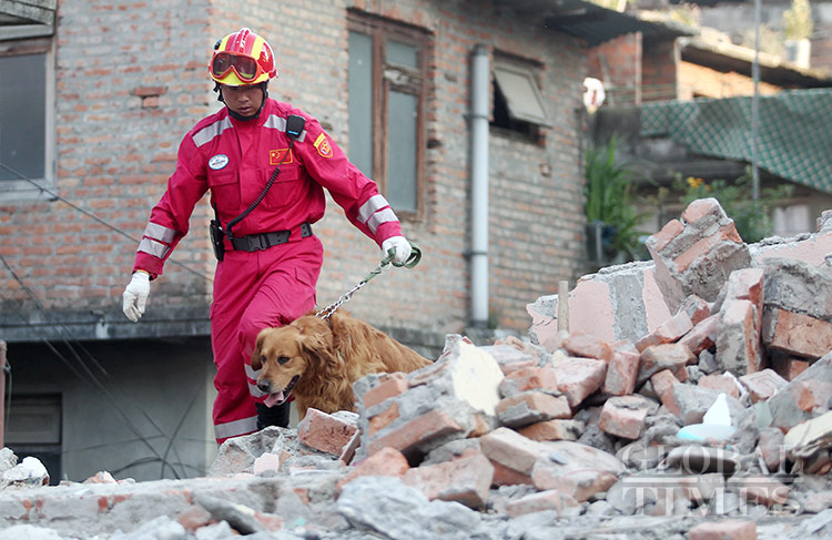 A member of the Chinese national rescue team on Monday searches for signs of life among the debris of a building in Katmandu. More Chinese rescue and medical personnel are rushing to earthquake-devastated areas in Nepal. Photo: Cui Meng/GT