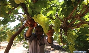 A Palestinian farmer harvests grapes in his field during the harvest season in the southern Gaza Strip city of Rafah on June 6, 2018. (Xinhua/Khaled Omar)