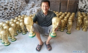 The owner of a pottery studio holds plaster World Cup trophy souvenirs in the Bat Trang ceramic village in Hanoi, capital of Vietnam, June 19, 2018. The Bat Trang ceramic village is renowned for its ceramic products of high quality. (Xinhua/Wang Di)