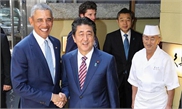 Former US President Obama and Japanese Prime Minister Abe shake hands in front of a sushi restaurant in the Ginza shopping district, Tokyo on Mar. 25. (VCG/Pool)
