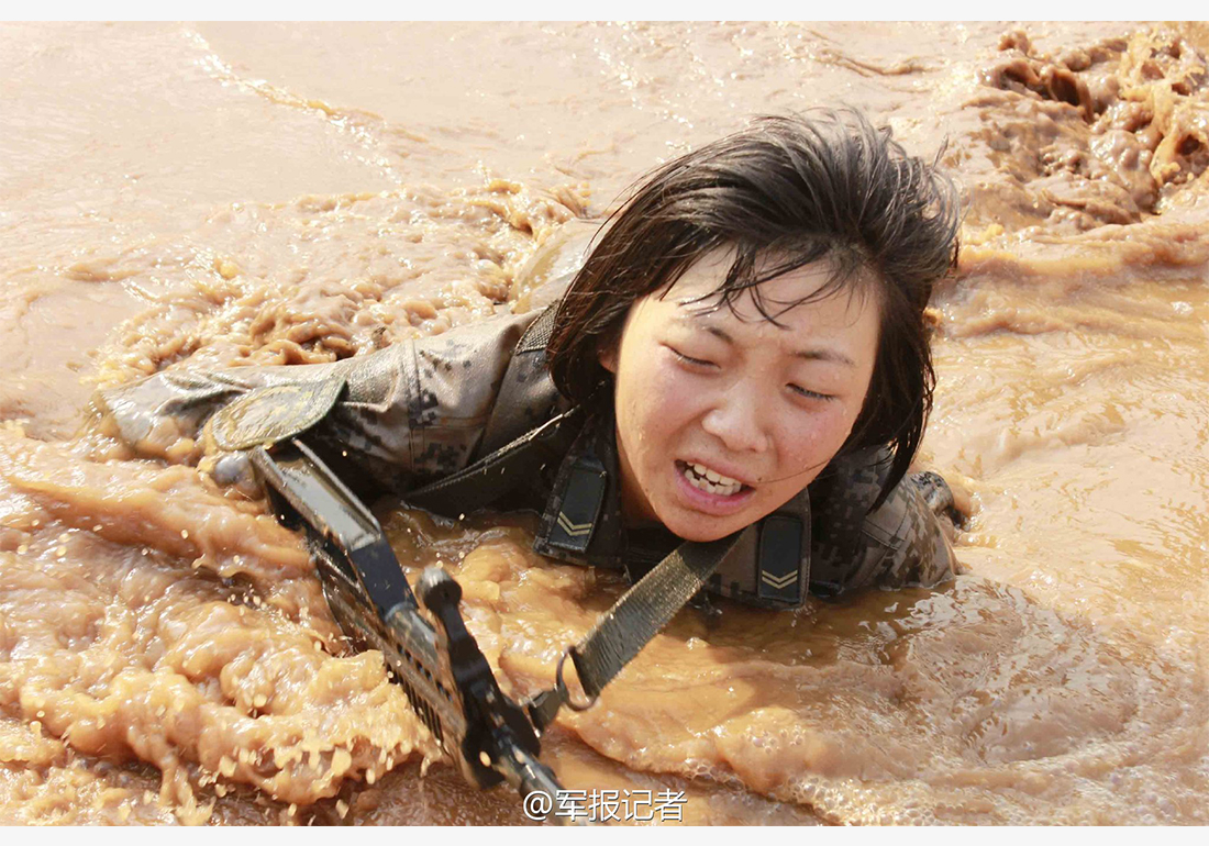 A female soldier from the 14th Group Army of the PLA Ground Force crawls through muddy water. Photo: weibo account “Junbaojizhe” figcaption >