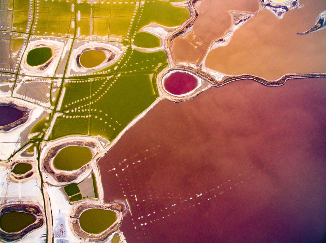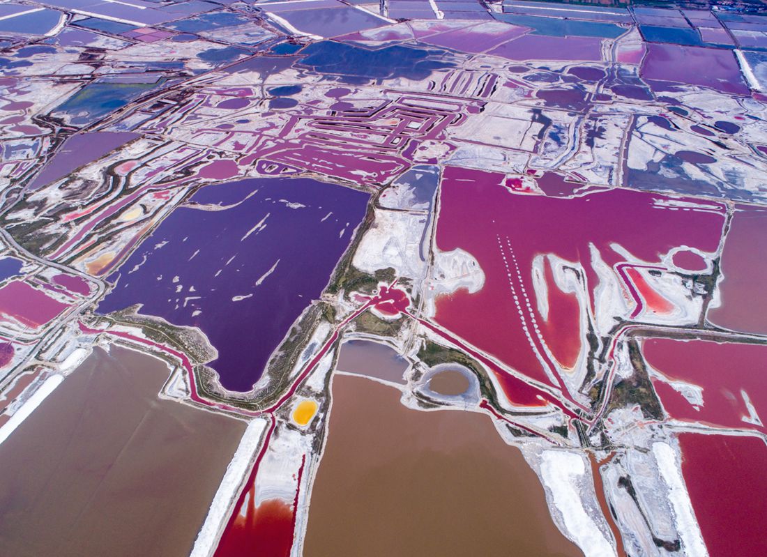 Aerial view of a salt lake turned into a palette of colors by the summer heat wave hitting large parts of North China's Shanxi Province on July 10, 2017. Photo: CFP figcaption >