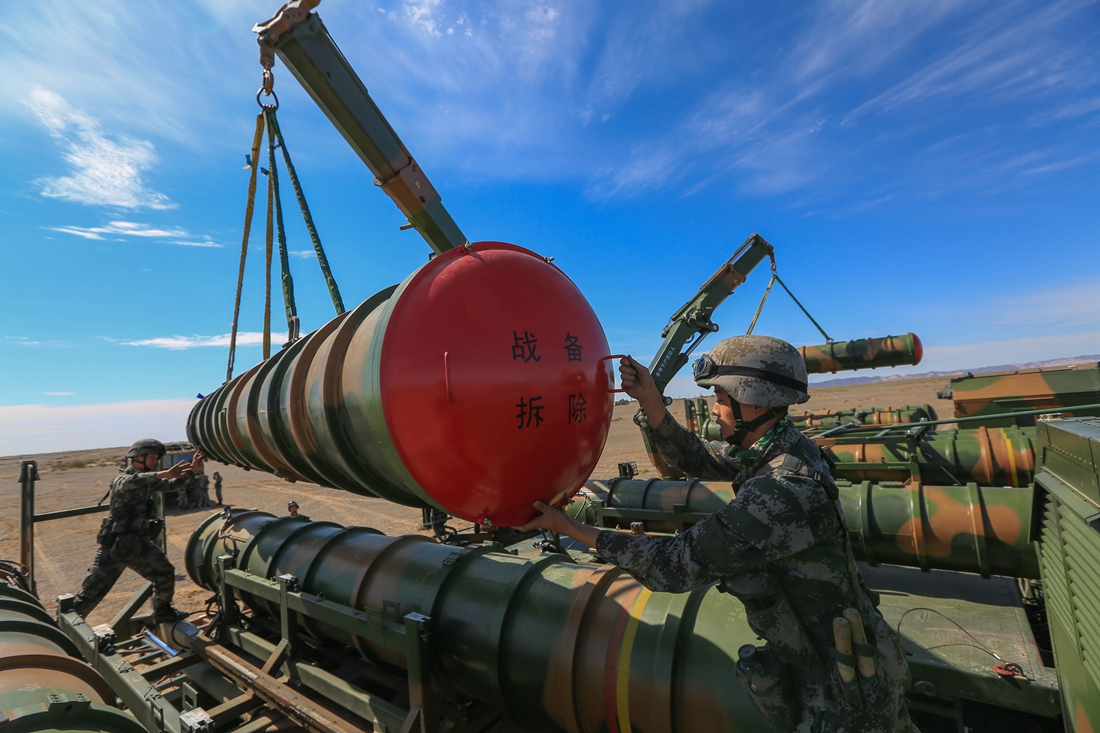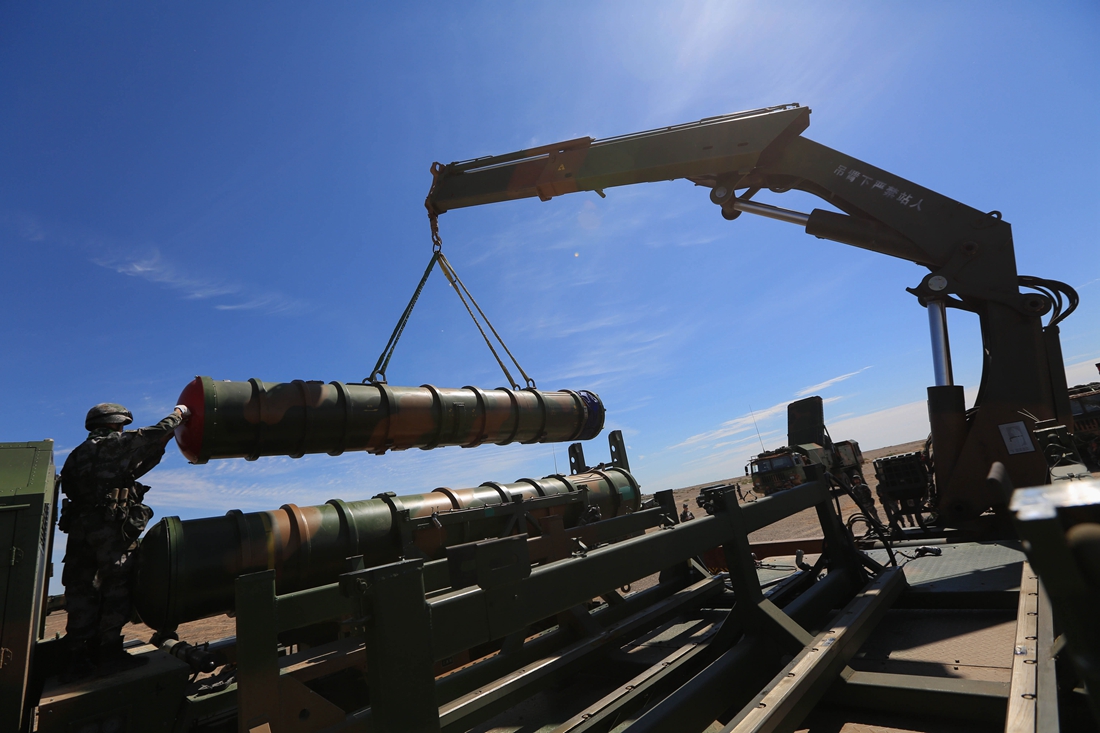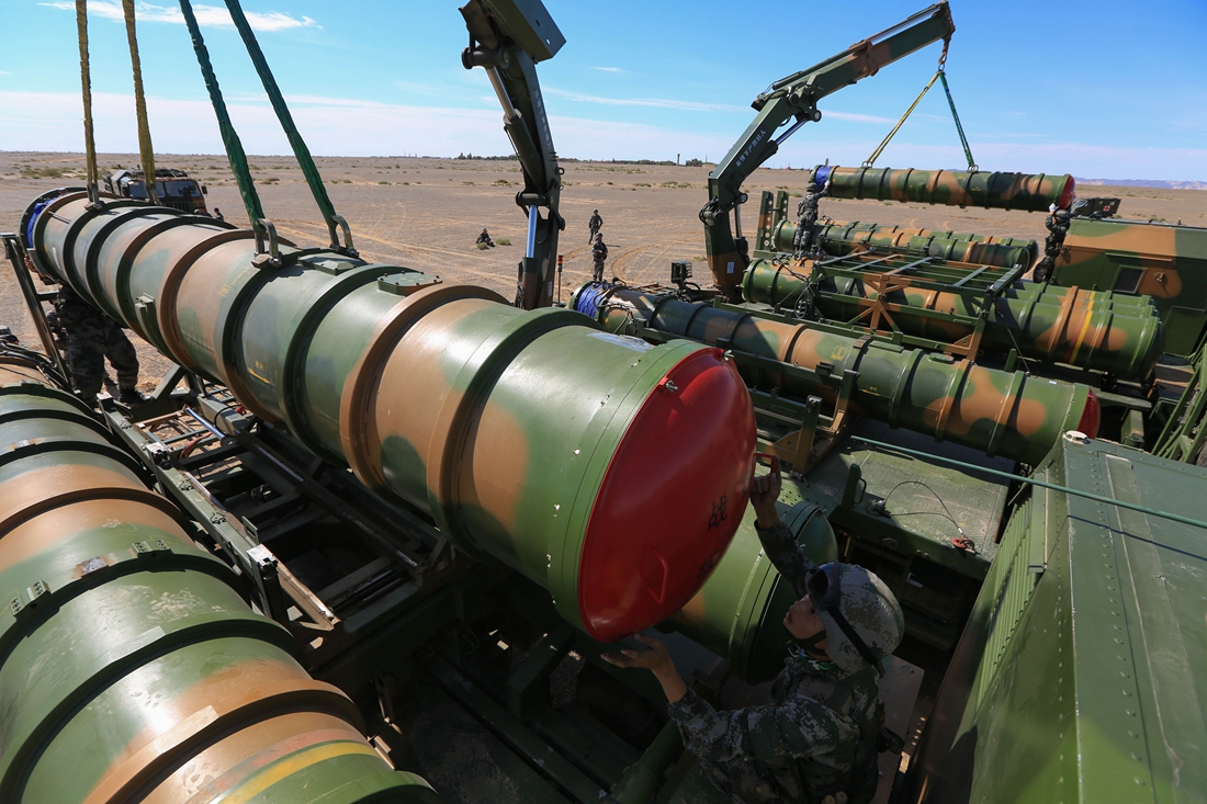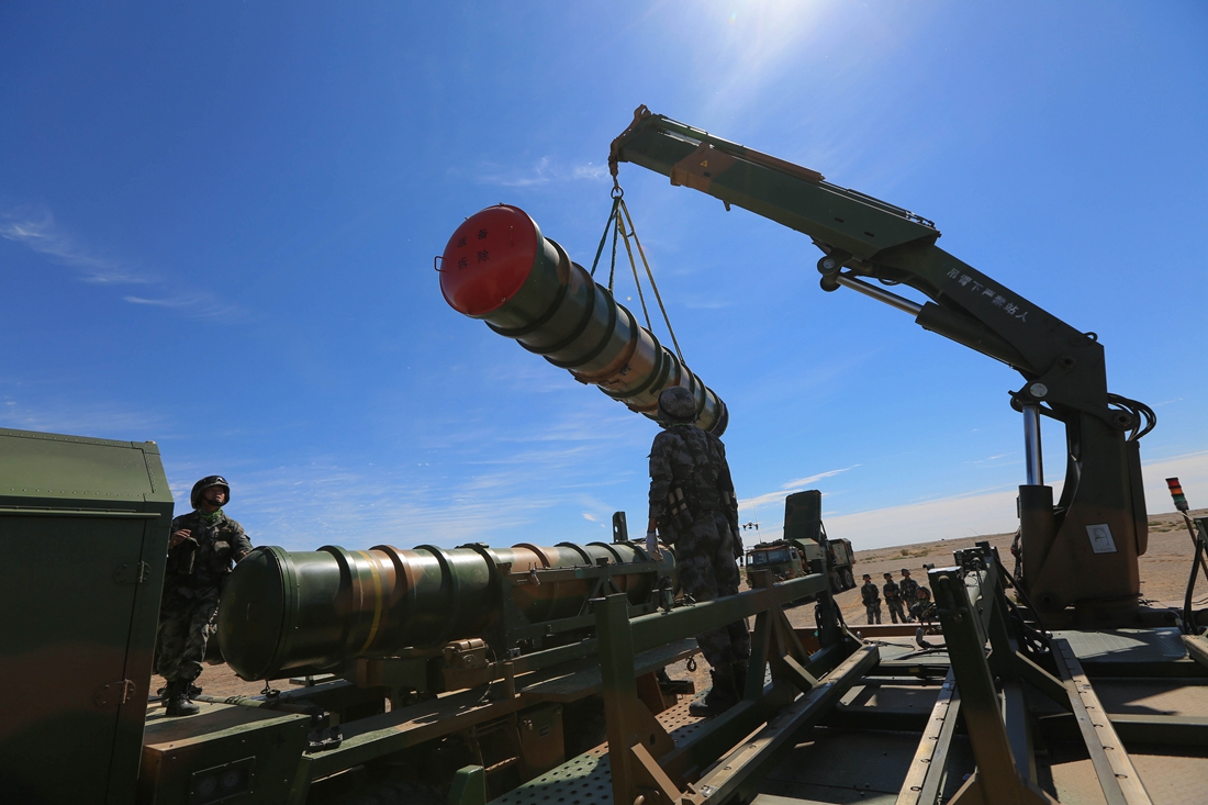 Soldiers assigned to an air-defense brigade with the PLA 72nd Group Army operate a crane to load HQ-16 medium-range anti-aircraft missile systems onto a missile launching truck prior to a live-fire training exercise on July 24, 2017. (eng.chinamil.com.cn/Photo by Tong Zujing)