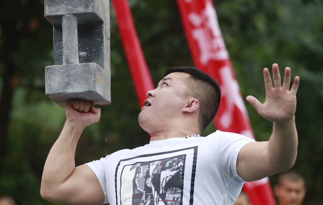 A man demonstrates his stone lock lifting skills at the event. Photo: Li Hao/GT figcaption >