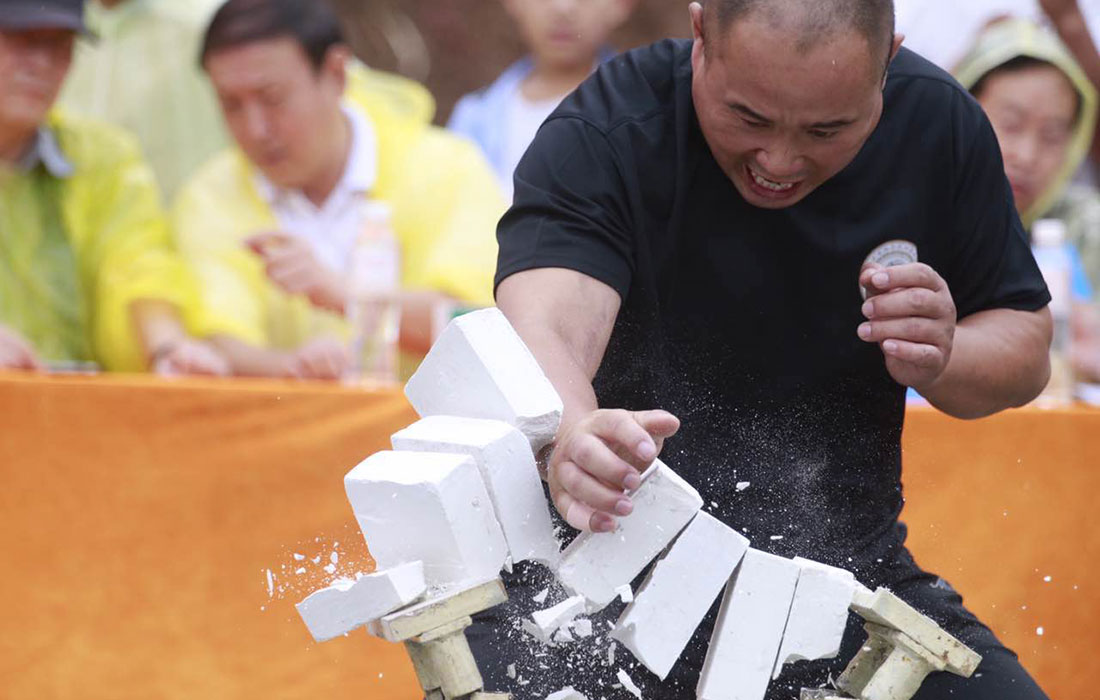 A contestant demonstrates his art of the Iron Palm, or block breaking, during the event. Photo: Li Hao/GT figcaption >
