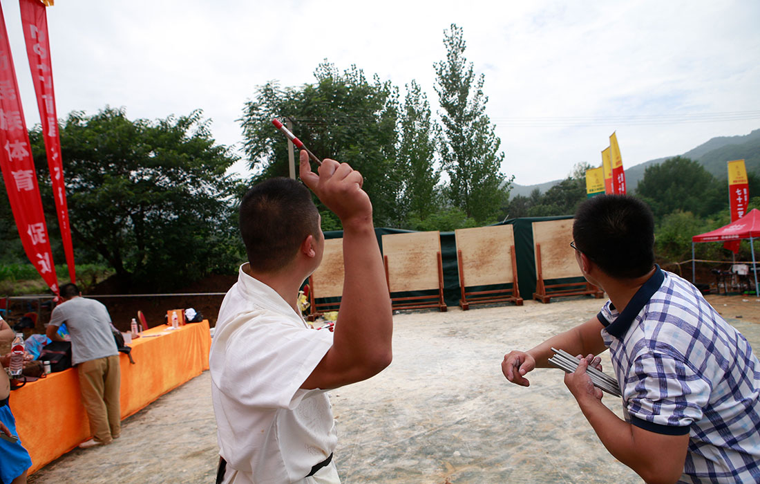 Two participants throw knives in a competitive event. Photo: Li Hao/GT figcaption >