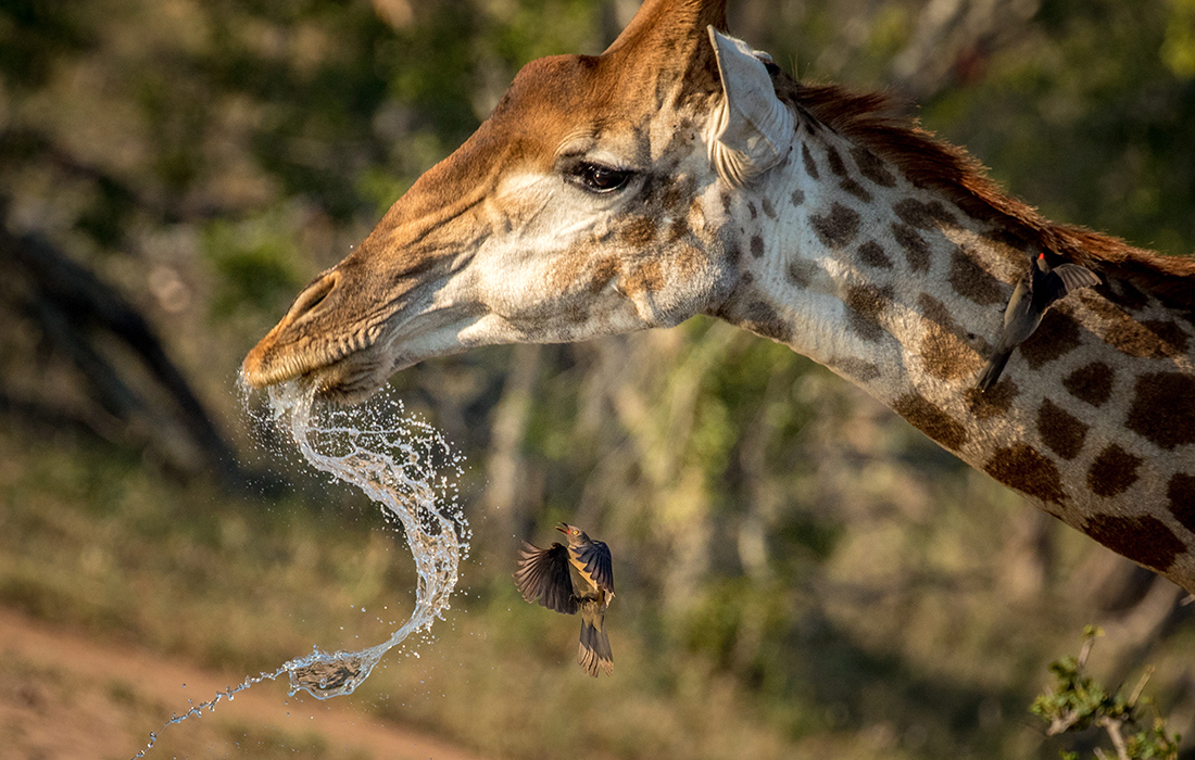 A Cape giraffe sprays water to get rid of a bird that wants to feed on its ticks in Greater Kruger National Park, South Africa. Photo: Samuel Cox/Solent News/VCG