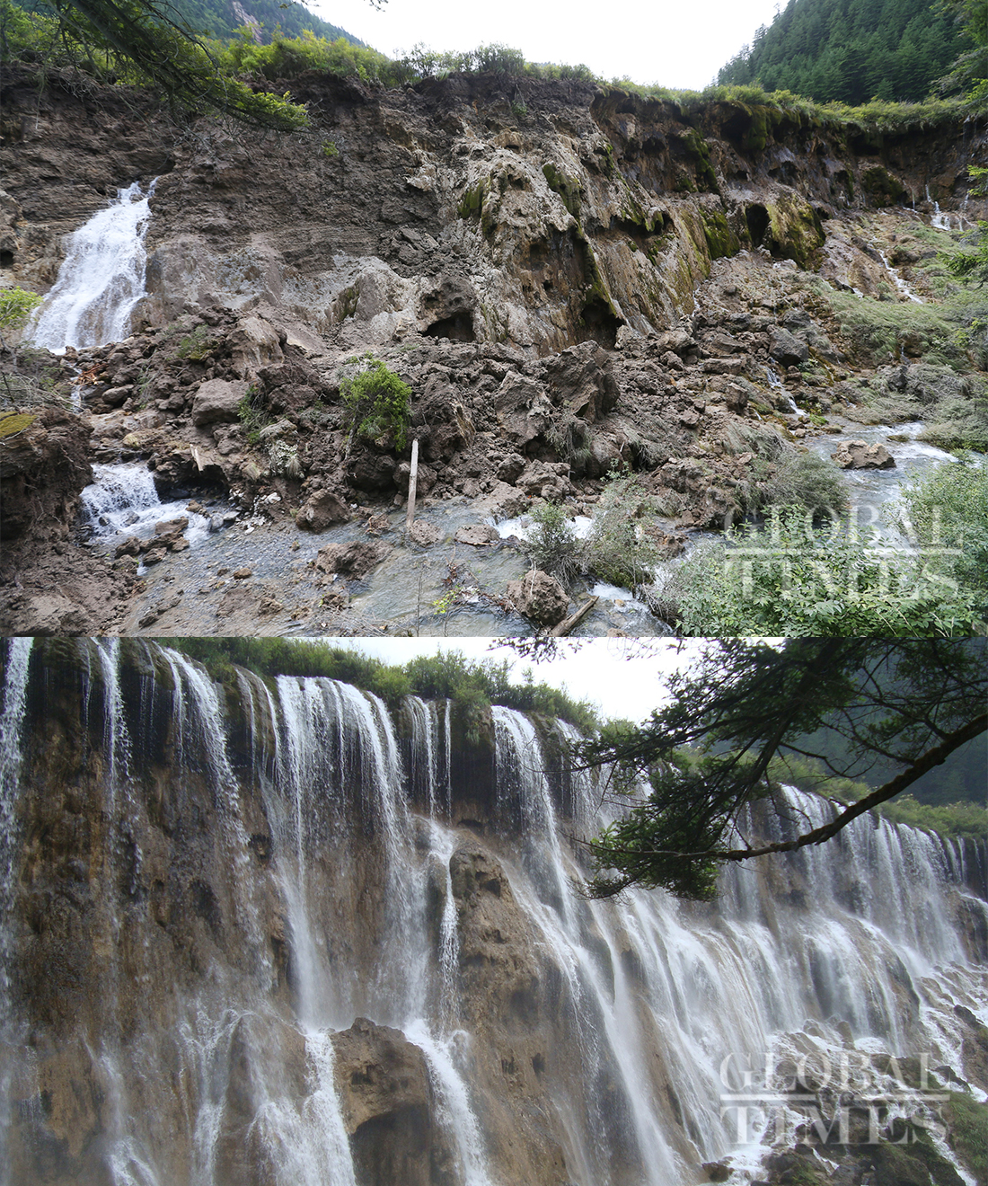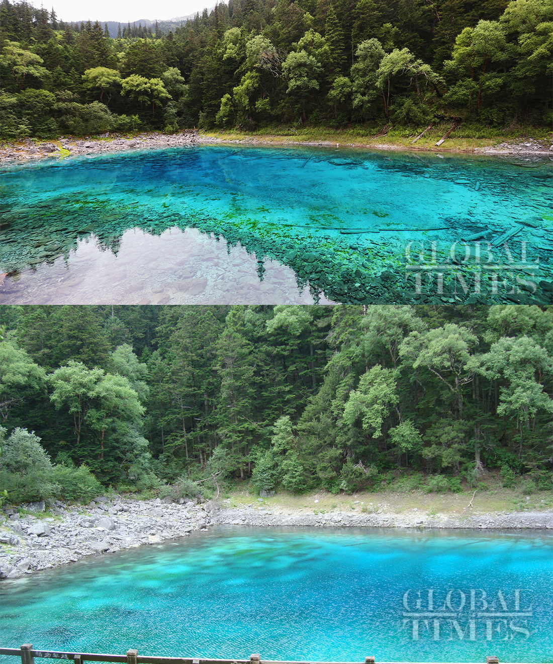 Top: The Colorful Pool, the smallest haizi in Jiuzhai Valley, is seen unaffected and as colorful as ever on August 11. Below: The same scenic area captured on July 15, 2009. Photo: Cui Meng/Du Liya/GT figcaption >