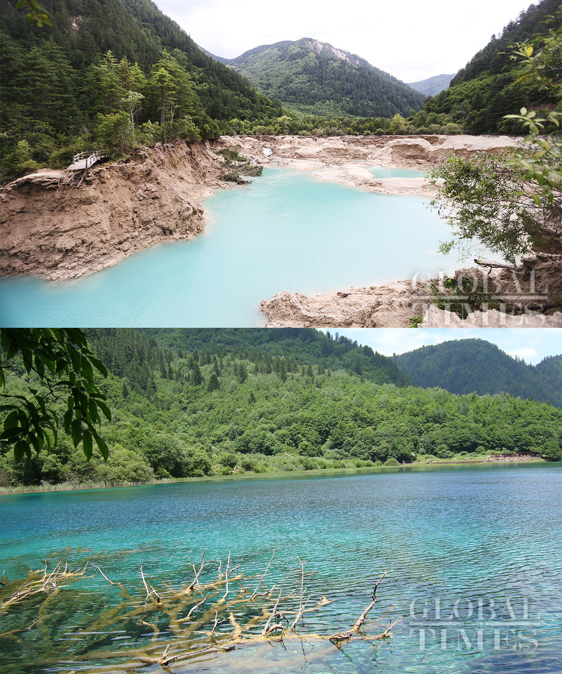 A comparative photo shows the sharp contrast of Sparkling Lake, the most popular scenic spot in Jiuzhai Valley, before and after the deadly earthquake. Above is the quake-destroyed lake on August 11. Below is the beautiful view of Sparkling Lake on July 16, 2009. Photo: Cui Meng/Du Liya/GT figcaption >