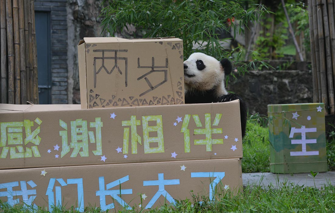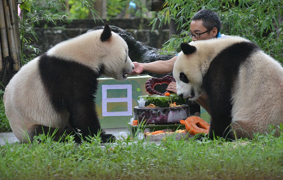 Panda twins Qingqing and Bingbing celebrate their 2nd birthday at Dujiangyan base of the China Conservation and Research Center for the Giant Panda, Southwest China's Sichuan Province, on August 18. Photo: Courtesy of the China Conservation and Research Center for the Giant Panda