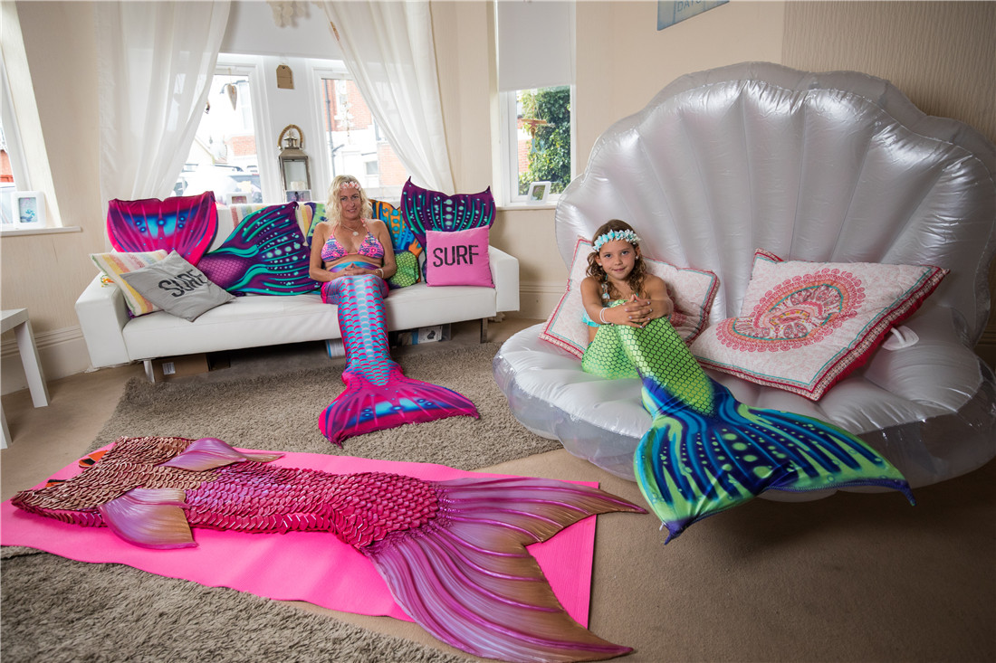 Mermaiding instructor Michelle Forsbrey, 42, (left) and her niece and student Erin Forsbrey, aged 8, pose for a photograph at her home in Boscombe, UK on August 19, 2017. Photo: VCG figcaption >