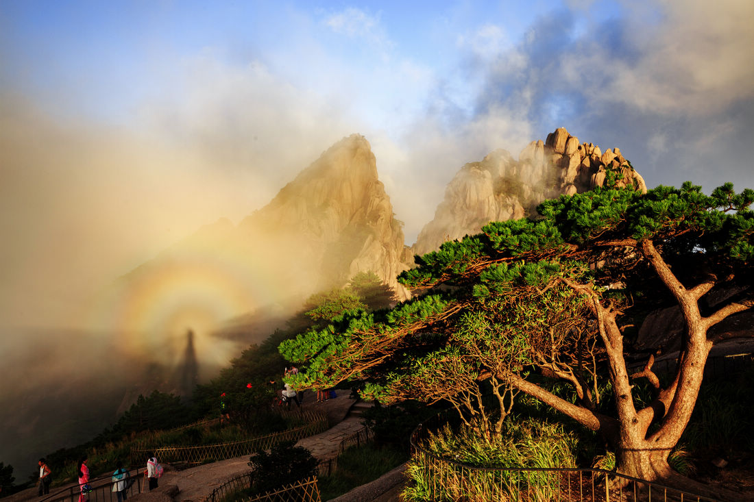 Tourists admire a “Buddha's Light” amid a sea of clouds as the sun sets at Aoyu Peak, more than 1,700 meters above sea level at Huangshan Mountain in East China’s Anhui Province on August 23, 2017. The optical phenomenon is caused by sunlight refracting off water droplets into rainbow-like, concentric rings. The phenomenon has been visible at the site in recent days. Photos: VCG