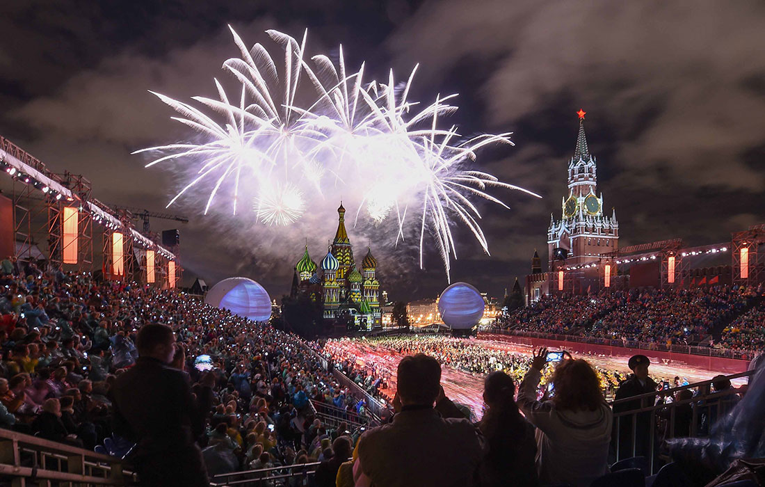 A crowd watches a fireworks display above Saint Basil's Cathedral during the Spasskaya Tower International Military Music Festival in Red Square, Moscow, Russia, on August 26, 2017. Photo: VCG