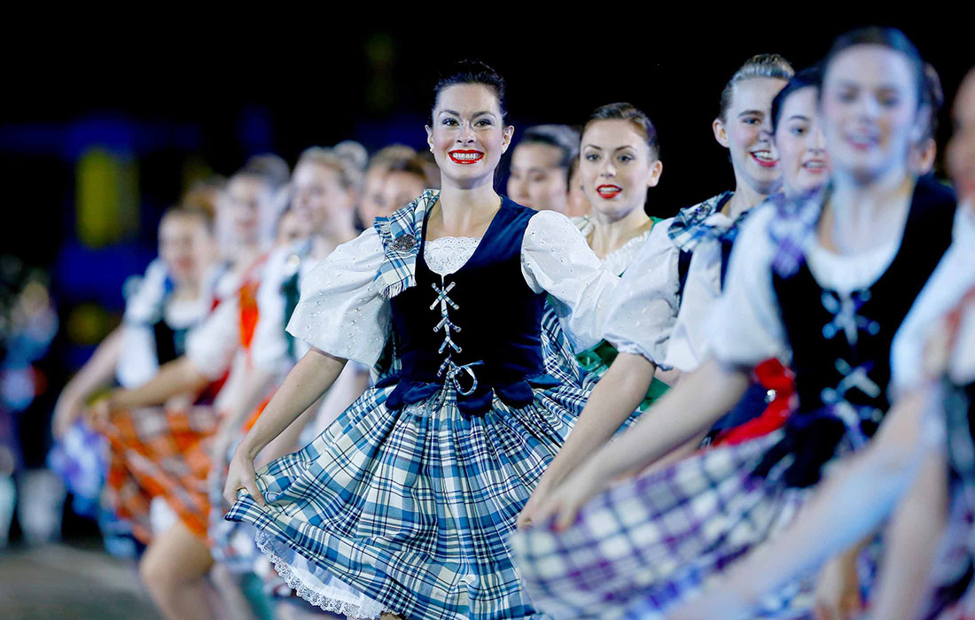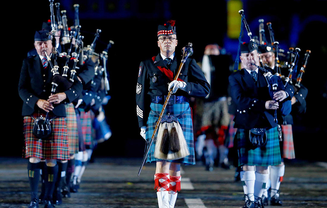 Members of the Celtic Massed Pipes and Drums perform during the opening ceremony of 2017 Spasskaya Tower International Military Music Festival in Red Square, Moscow, Russia, on August 26, 2017. Photo: Sefa Karacan/Anadolu Agency/Getty Images/VCG figcaption >