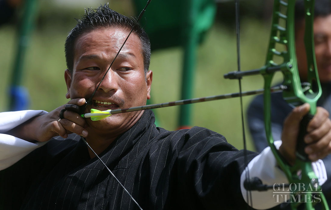 Bhutanese military policemen participate in an archery competition in Haa district, Bhutan. Photo: Cui Meng/GT figcaption >