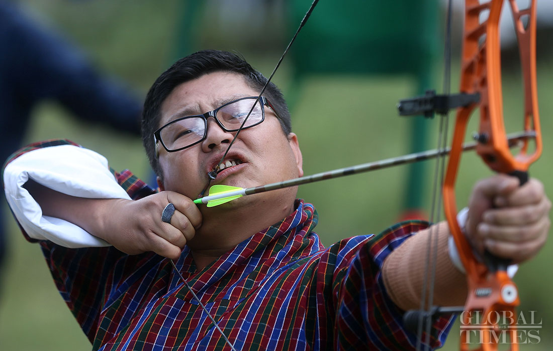 A Bhutanese military policeman participates in an archery competition in Haa district, Bhutan. Photo: Cui Meng/GT figcaption >