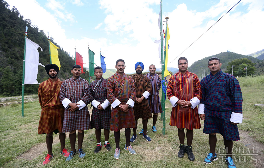 Indian soldiers wearing traditional Bhutanese costumes pose for a photo in Haa district. Photo: Cui Meng/GT