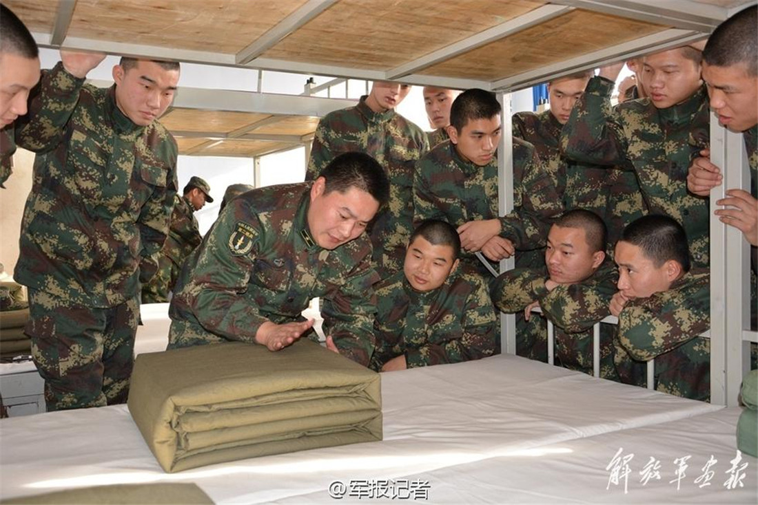 Recruits learn the proper way to make a bed. figcaption >
