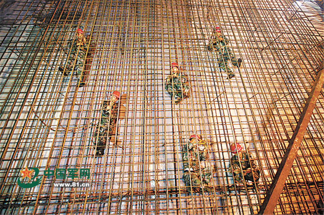 Soldiers work to lay a network of rebar. figcaption >