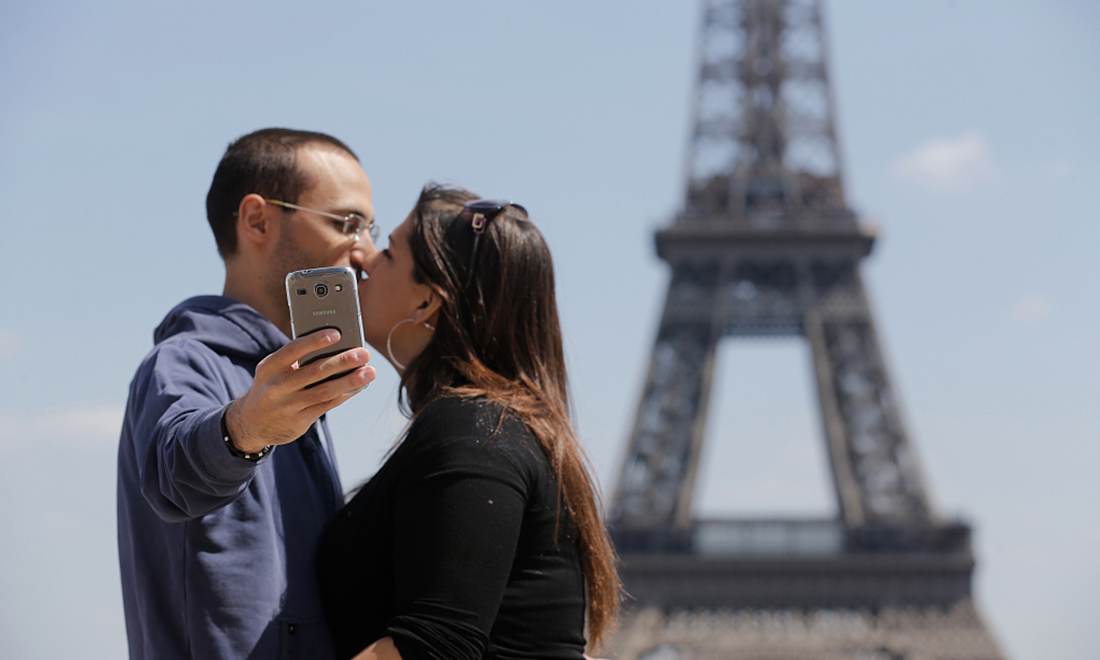 A couple takes a selfie as they kiss on Trocadero Square near the Eiffel Tower in Paris, France on May 16, 2014. Photo: Christian Hartmann/REUTERS/VCG figcaption >