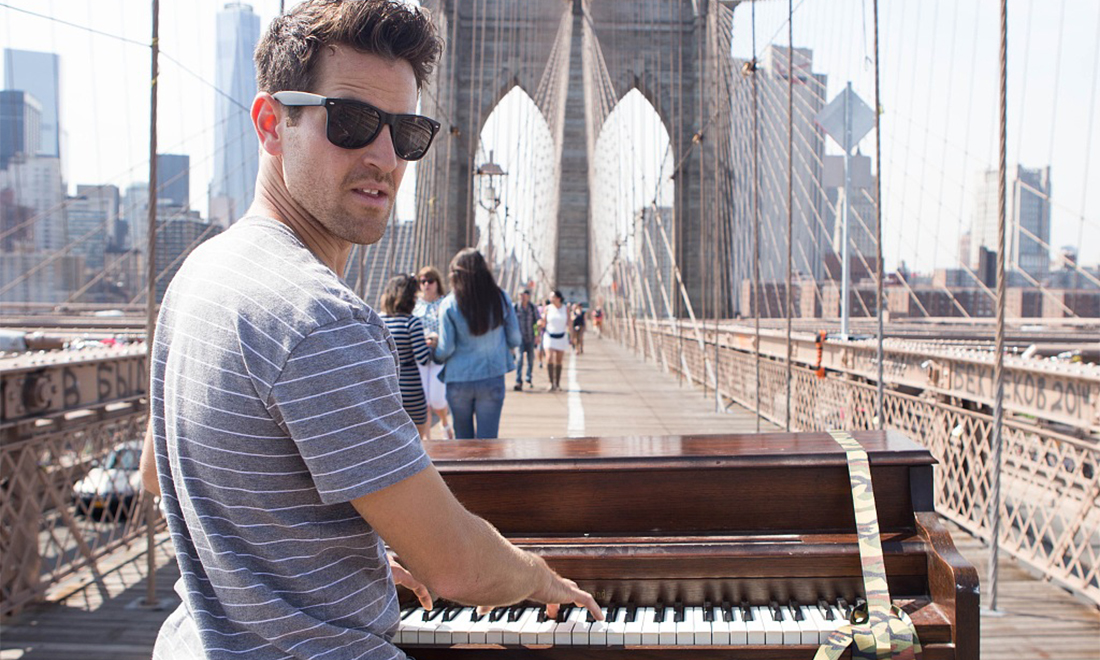 Dotan Negrin plays piano on the Brooklyn Bridge. Negrin quit his job in 2010 to travel the world with his dog and piano. Over five years, Negrin visited more than 300 cities in 21 countries. Photo: pix Media/VCG figcaption >