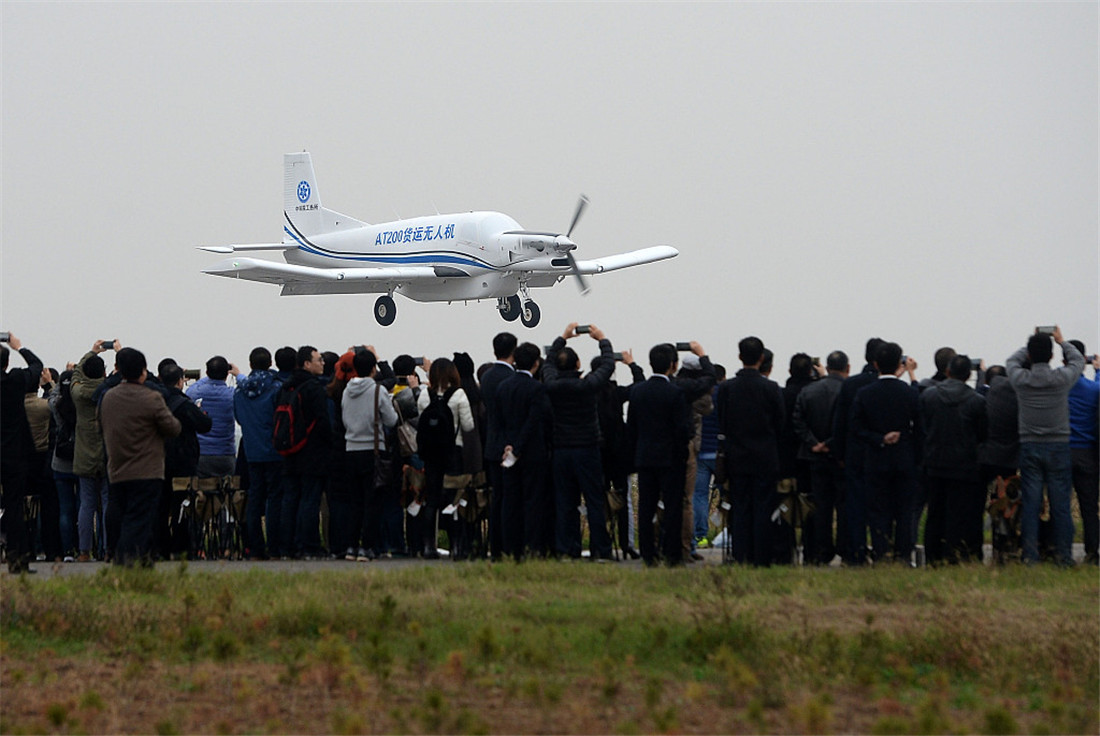 A crowd watches as China’s heaviest cargo drone, the AT200, takes flight in Pucheng of Weinan, Shaanxi Province on October 30, 2017. The AT200 has a maximum take-off weight of 3.4 tons and a payload of 1.5 tons, making it one of the world’s most powerful drones for civilian use, according to Xinhua report. The demo flight lasted for 28 minutes. Photo: VCG/Wang Xiao/ Chengdu Commercial Daily