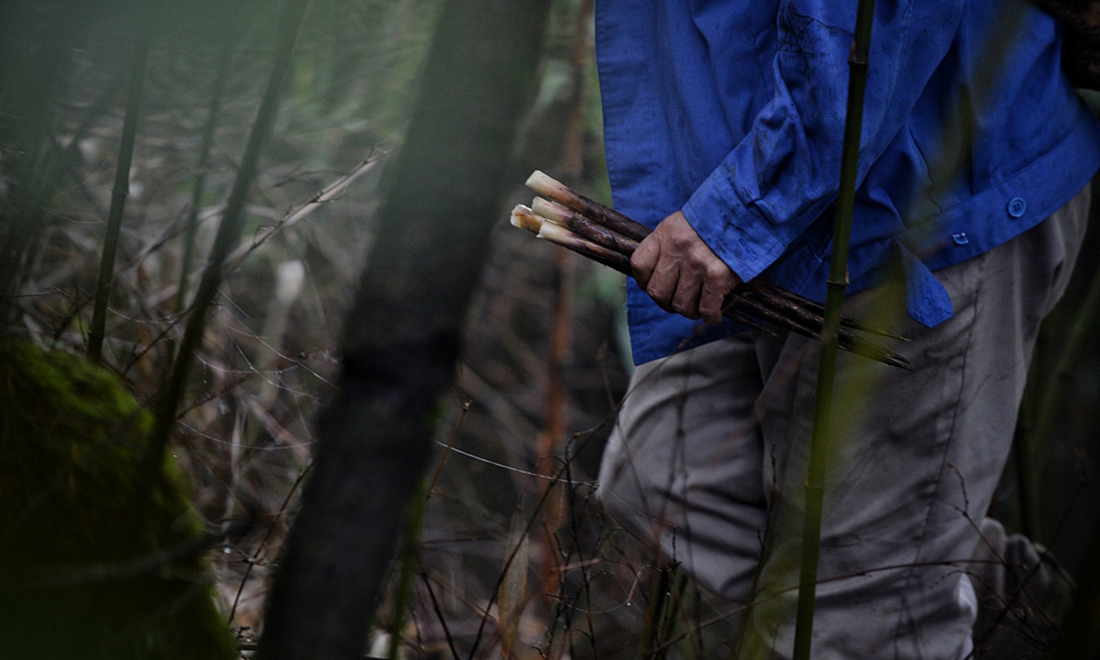 Zhou searches for bamboo shoots on the mountaintop October 20. He is one of 50,000 villagers who pick and produce 15,000 tons of bamboo shoots every year. Usually, one villager collects about 100 grams of bamboo each day, which sell for 2 yuan ($0.3) a gram. Photo: VCG figcaption >