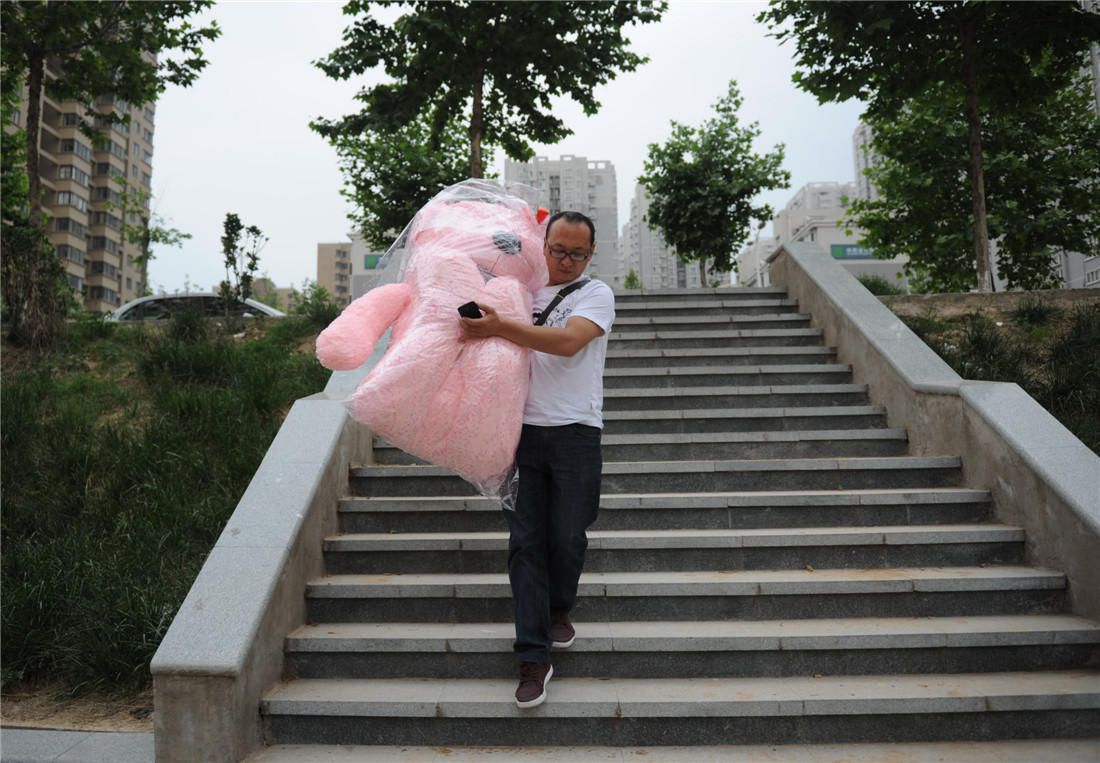 Dou, at a customer's request, takes a toy bear and prepares to confess the customer's love for a girl. figcaption >