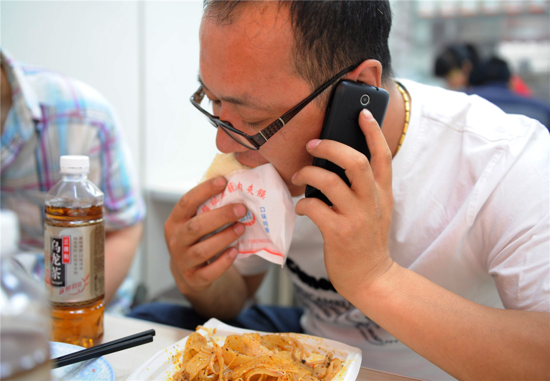 Dou talks to customers while taking his lunch. He always eats local fast food to save time. figcaption >