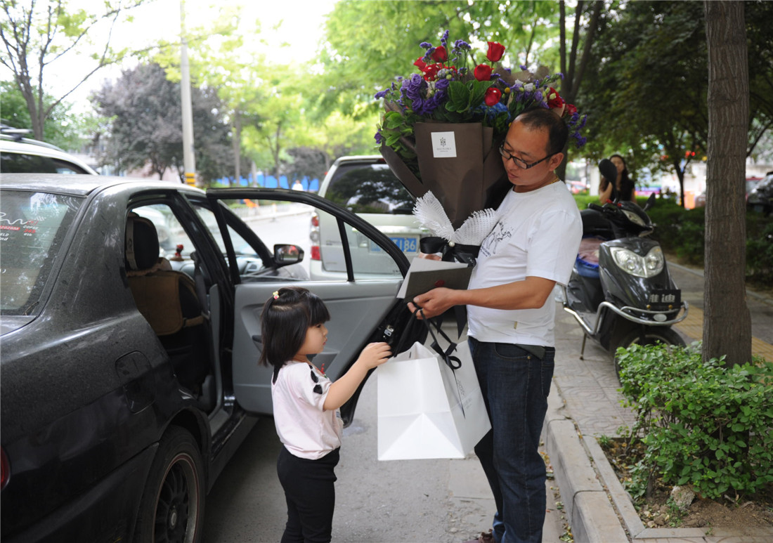 Dou is helped by his daughter while making a delivery of flowers and gifts. figcaption >