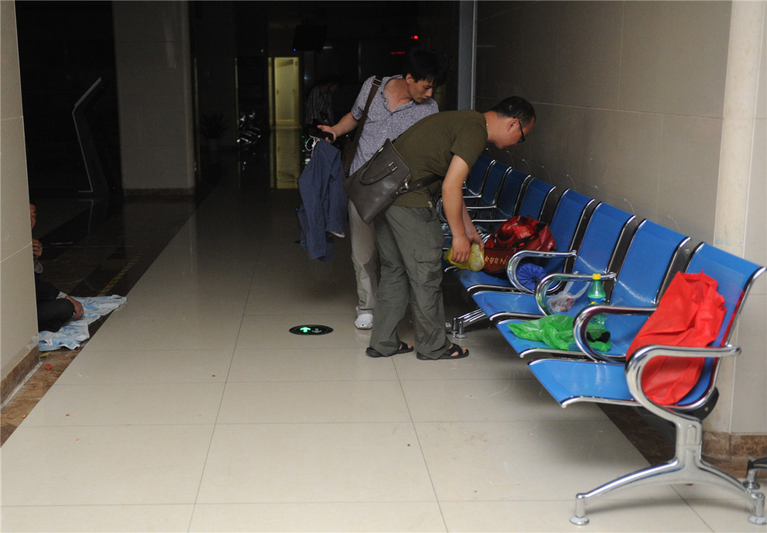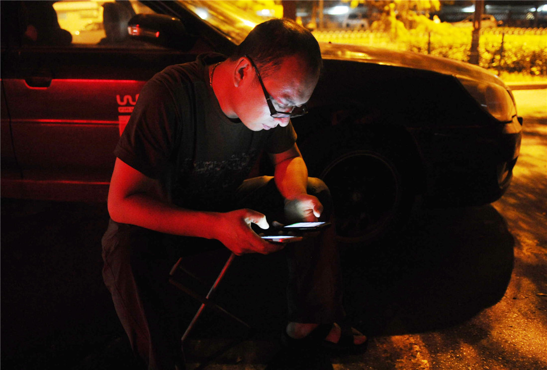 Dou Tianhui (center, dark green T-shirt), holds a customer's place in a queue for registration at a hospital in Xi'an, Shaanxi Province, on the night of May 19, 2015. It is common for people visiting major hospitals in large cities in China to have to queue through the night to register. Dou started his errand company in Fujian Province in 2009, but in 2013 he sold his company and relocated to Xi'an. Photos: CFP