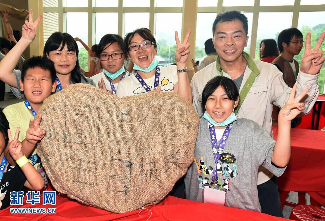 Local residents show their birthday gift for Yuanzai made of burlap at its birthday party in Taipei, East China's Taiwan, on July 4. Photo: Xinhua figcaption >
