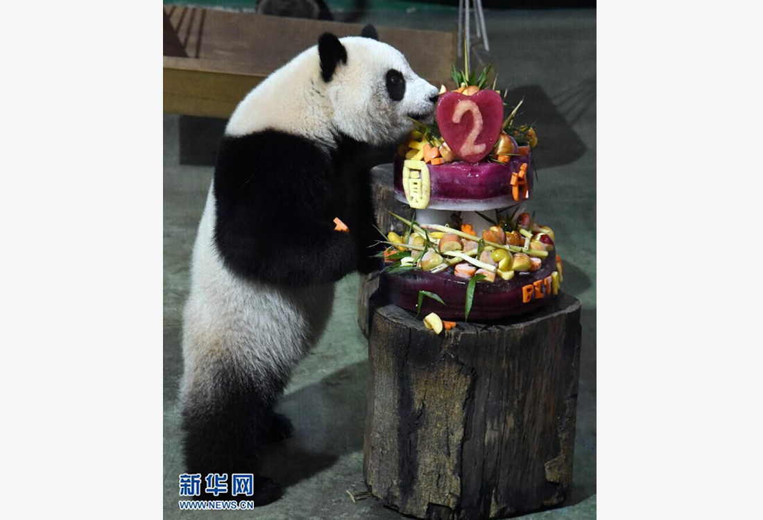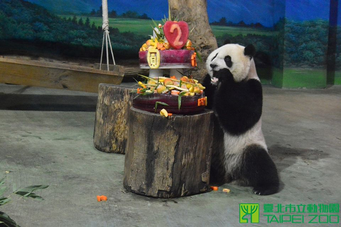 Yuanzai eats an iced birthday cake made of apples, pineapples, bamboo shoots, bamboo leafs and beets at the Taipei Zoo, Taiwan, on July 4. Photo: Xinhua figcaption >